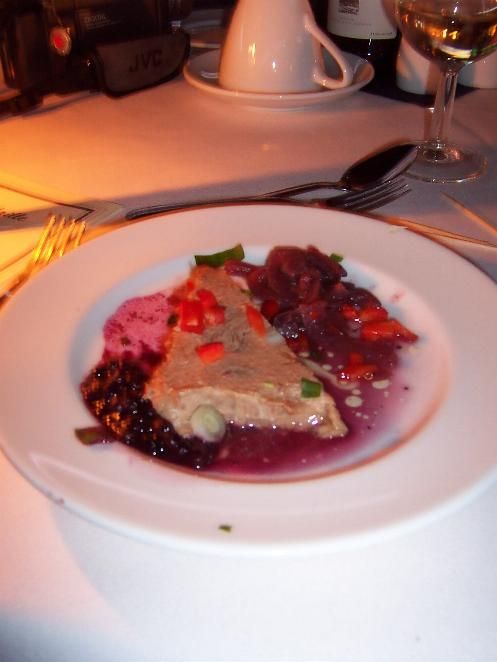 On nous sert un original « brouet d'épices », potage aux légumes agrémenté de gingembre, cumin, cardamome et autres bouquets de Provence, qui a été très apprécié. Ensuite ce furent des rillettes de canard avec confiture d'oignons et de bleuets, puis une « longe de porc en daube » avec ses petits légumes.