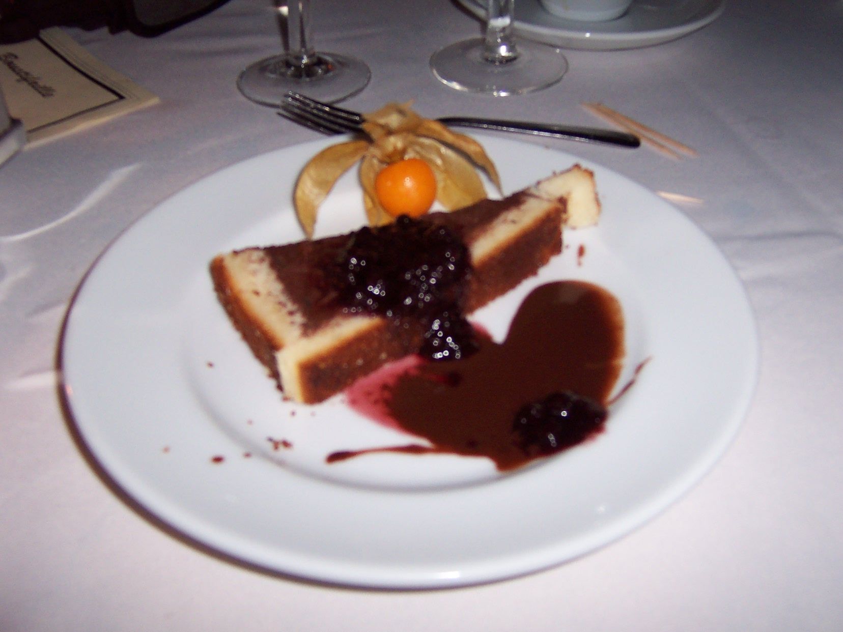 Enfin pour terminer une « marquise au chocolat noir », génoise garnie d'une mousse au chocolat et d'un coulis de fruits des champs.